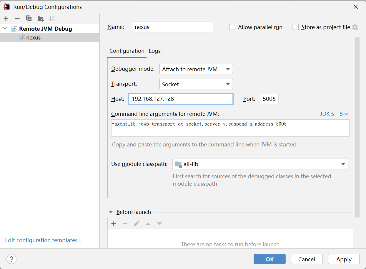 | docker run -d -p 8081:8081 -p 5005:5005 --name nexus -e INSTALL4J_ADD_VM_PARAMS=" -agentlib:jdwp=transport=dt_socket,server=y,suspend=n,address=5005" sonatype/nexus3:3.68.0-java8
